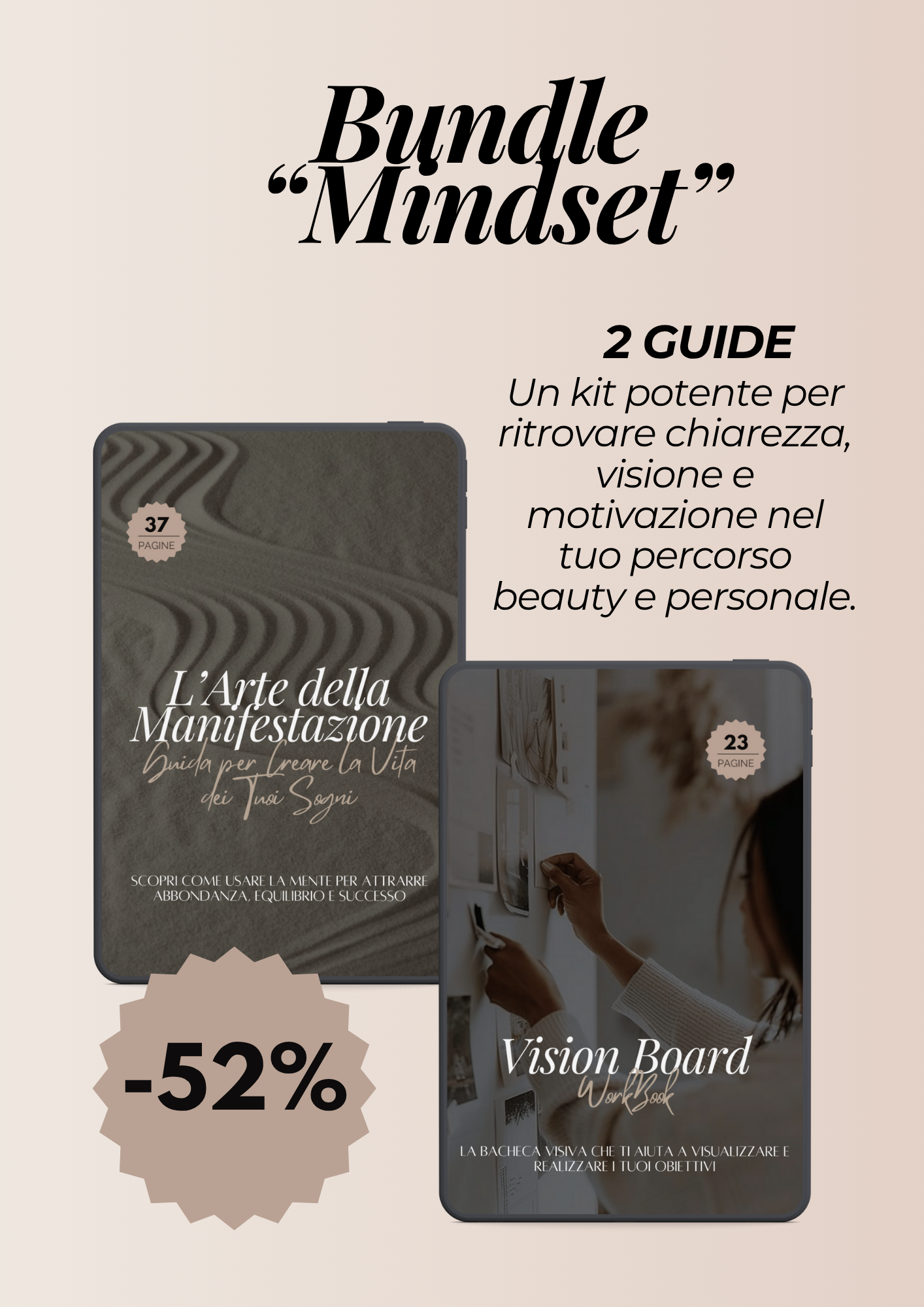 Ogni cambiamento esterno parte da dentro. Il bundle Mindset è pensato per estetiste, freelance e imprenditrici del mondo beauty che vogliono allineare mente, obiettivi e azioni. Con questi due strumenti potrai mettere a fuoco i tuoi desideri, visualizzare il futuro che vuoi realizzare e imparare a manifestare con intenzione e metodo.